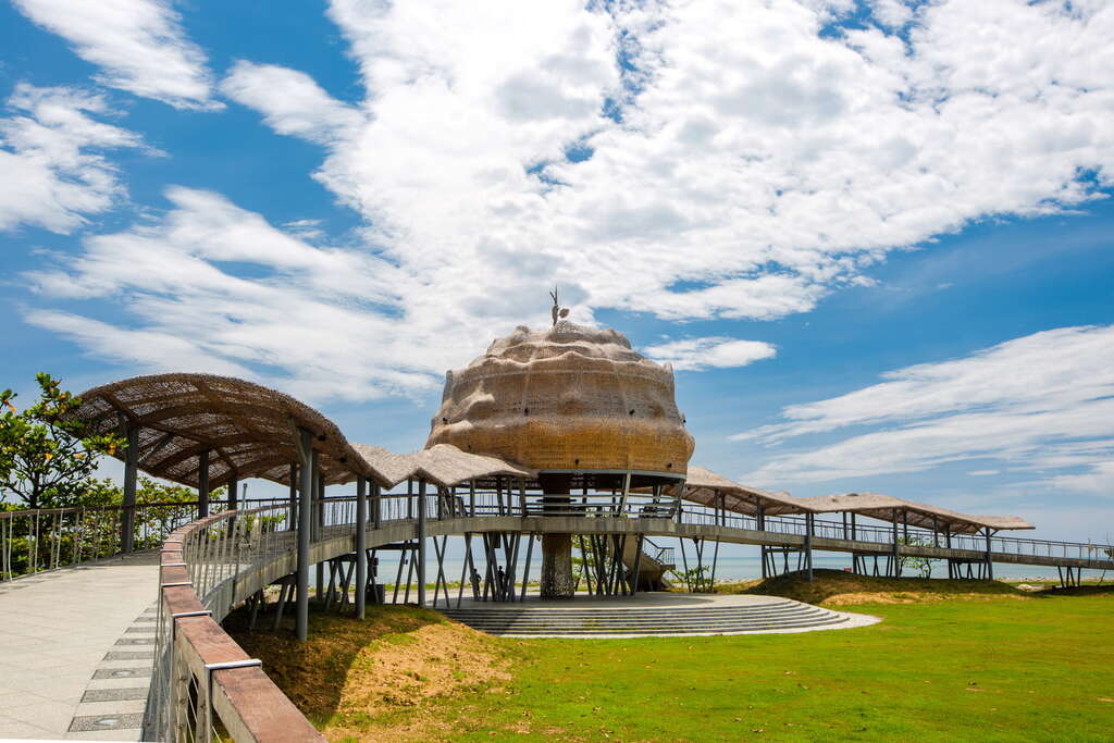 佇立在臺東海濱公園的國際地標,融合地景與公共藝術,標誌臺東獨特的人文、歷史與自然景觀,獨樹一格的藤編屋頂造型讓人眼睛一亮。國際地標靜靜佇立海岸,白天,它迎接清晨的第一道曙光,夜晚,暈黃燈光照耀,輝煌燦爛,彷彿期盼著世界的眼光。
